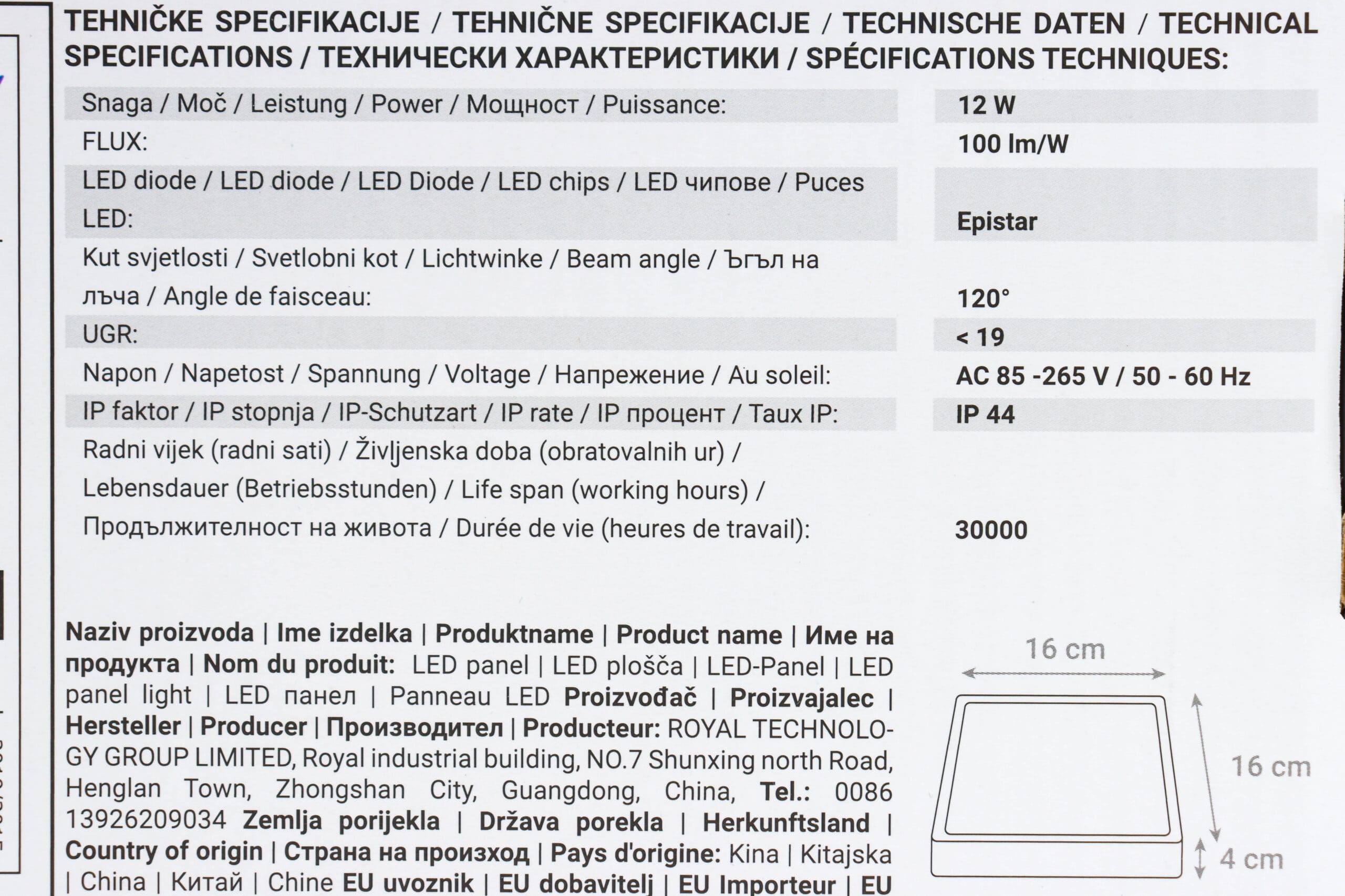 Dimenzije svjetiljke: 160 x 160 x 40 mm